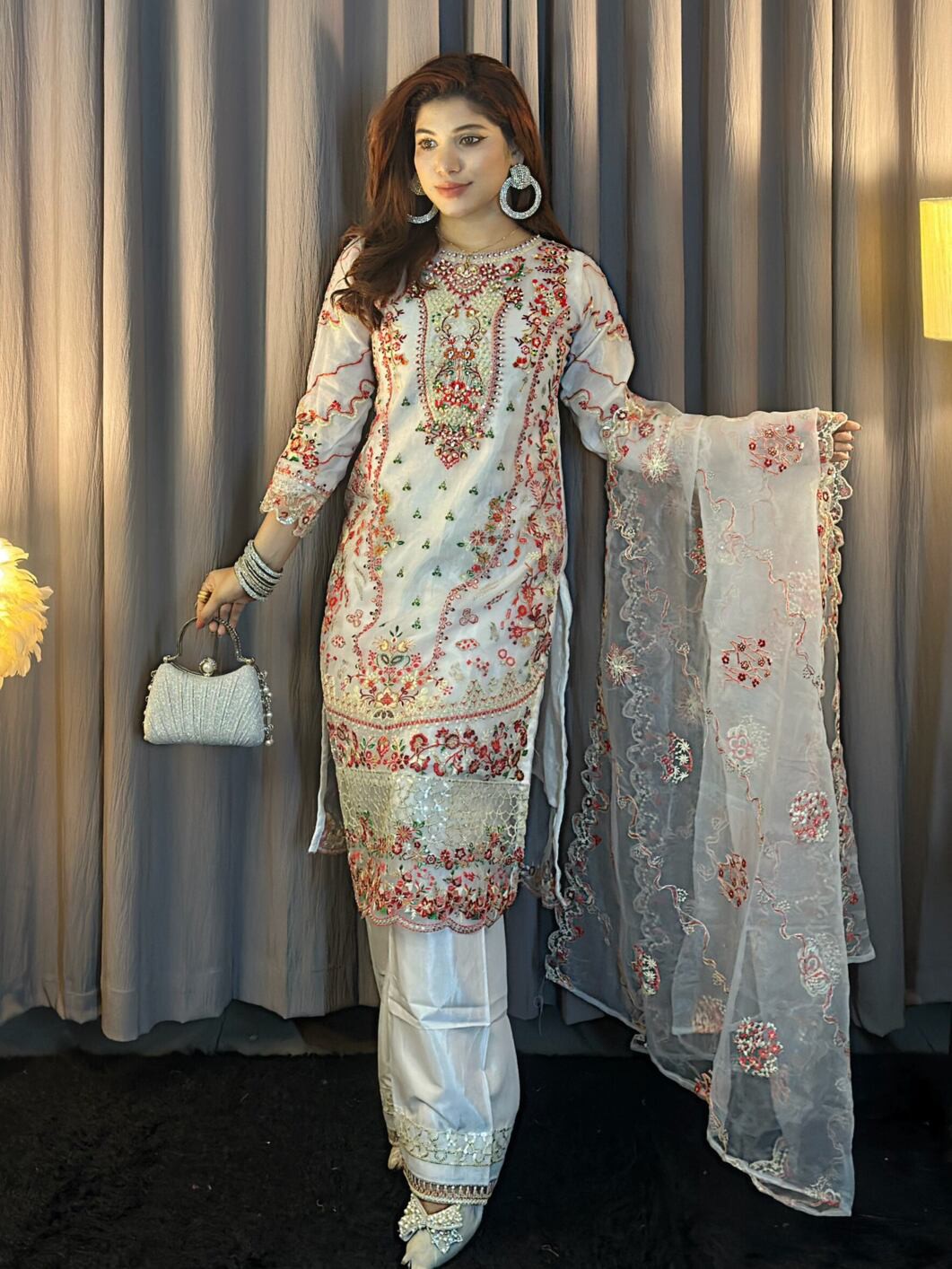 This exclusive 3-piece set is crafted from premium Organza Sadabahar fabric, offering a lightweight, graceful, and sophisticated feel with every wear.